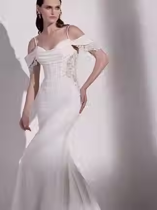 A mermaid-style gown crafted from delicate satin, elegantly contouring the silhouette.